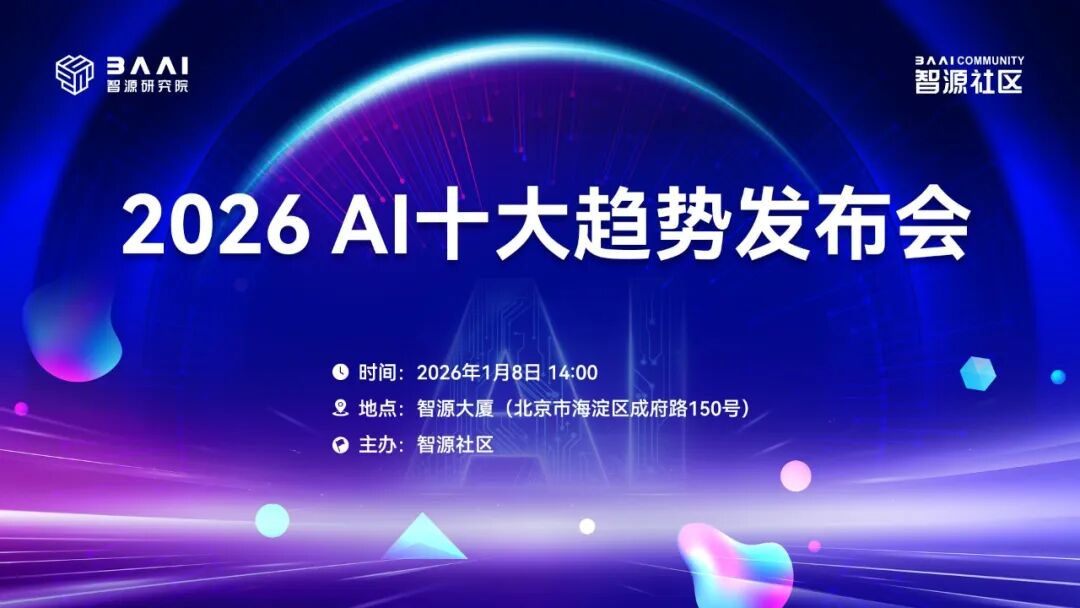 在技术迭代日新月异、产业变革加速演进的当下,厘清趋势才能预见未来。1月8日下午14:00,智源研究院将集结AI领域顶尖专家、产业领袖与科研学者,举办“2026智源十大趋势发布会”,提炼真正决定未来的关键趋势,锚定2026年AI发展的核心坐标。