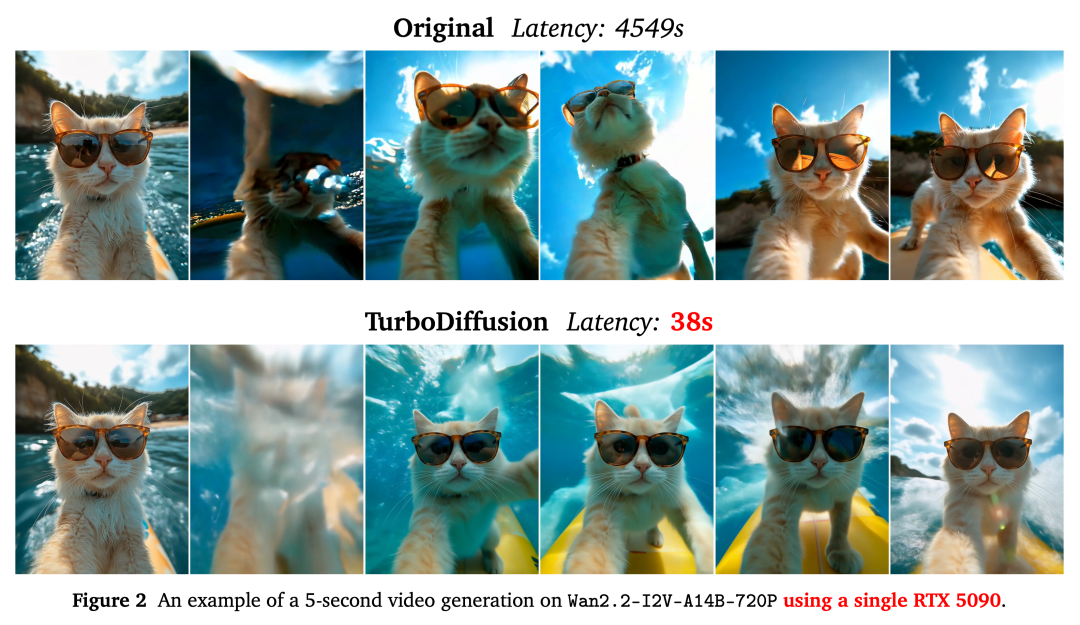 而TurboDiffusion的加速结果,在视频中做到了水下自拍、戴墨镜猫咪冲浪等元素都完整保留,而生成时间仅为38秒。也就是14B大小的图生视频模型生成5秒的720P视频,TurboDiffusion可以在单张RTX 5090几乎无损端到端加速119倍。