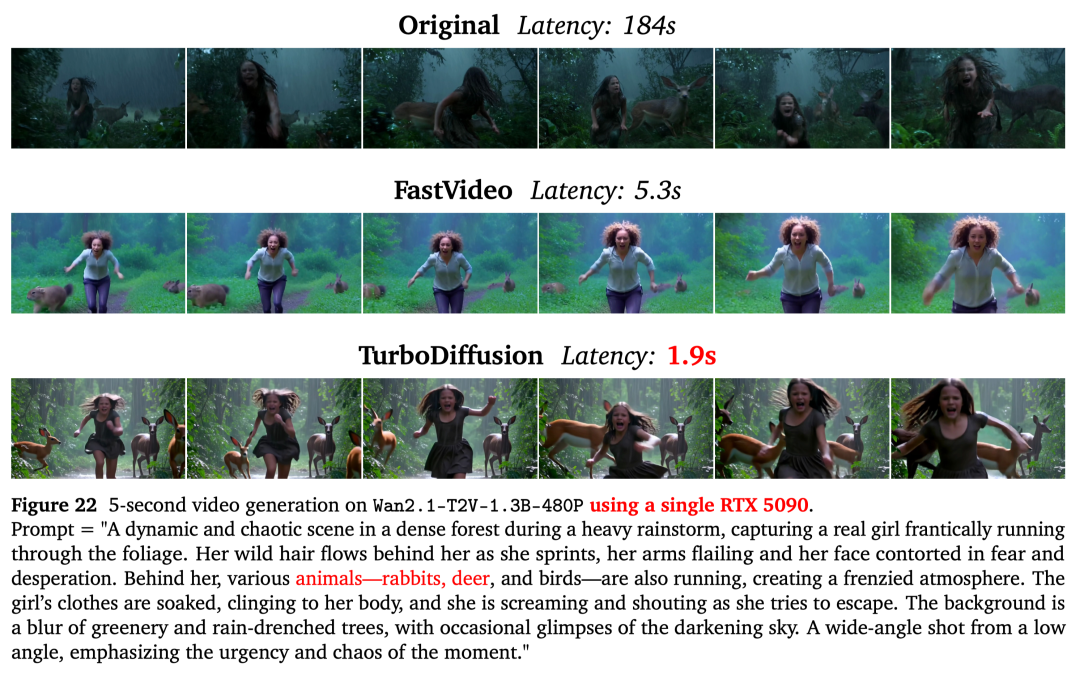 TurboDiffusion生成的视频内容在视觉上无明显差异,但却只需1.9秒。