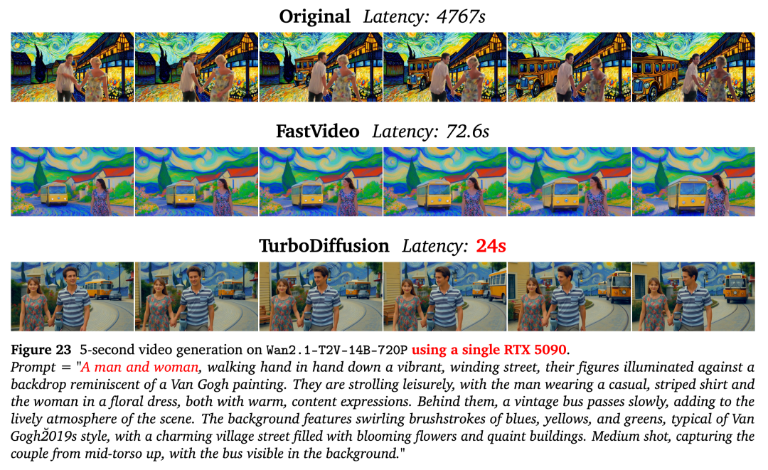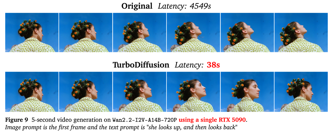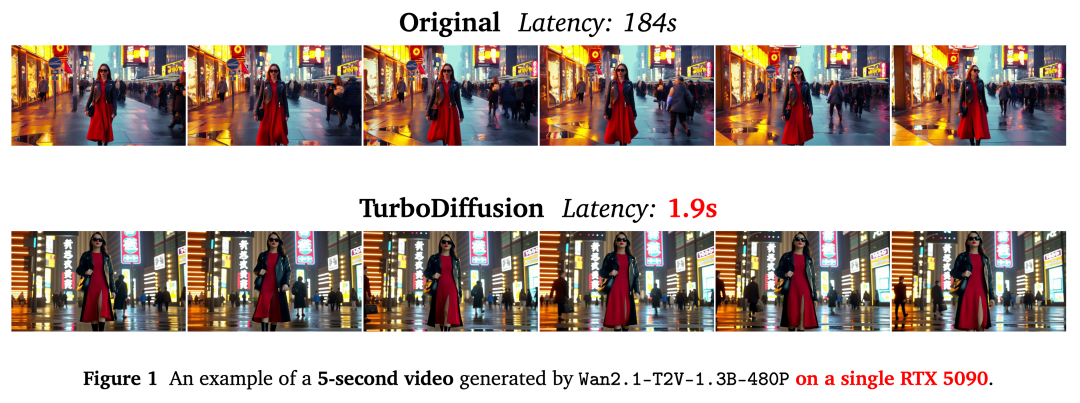 对于14B大小的文生视频模型生成5秒的720P分辨率视频,TurboDiffusion可以在单张RTX 5090上几乎无损端到端加速200倍。