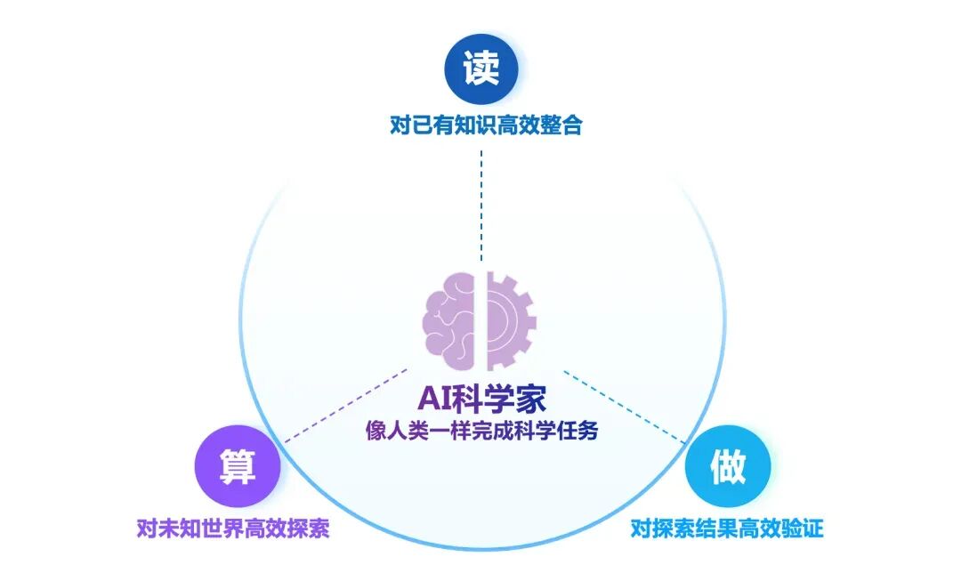 以科学智能体为驱动,贯通“读—算—做”闭环,面向AI4S场景构建通往人类未知知识的最短路径——读整合既有知识,算探索生成未知空间,做完成验证闭环,“AI科学家”由此成为能够学习、思考、执行与反馈的发现主体。