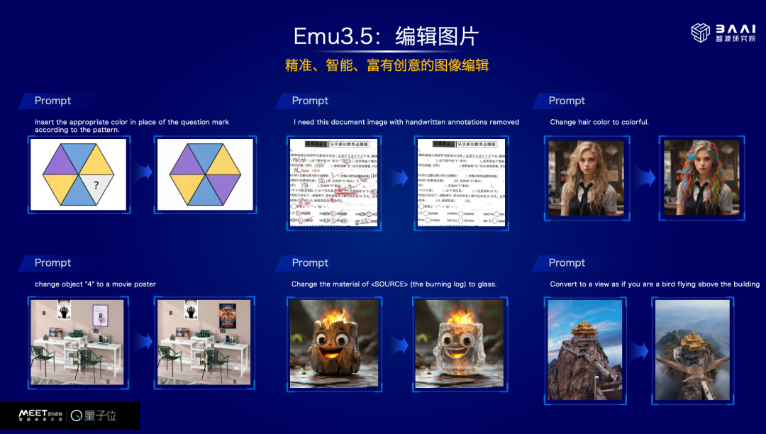 比如说在左上角的例子,我们给了一个指令,“把问号的区域换成合适的颜色”,模型能够通过语义推理填充符合逻辑的颜色;再比如中间的例子,指令是“将批改的卷子还原,把手写的部分去除”,这要求模型首先要识别出哪些属于手写的部分。右下角的例子里,我们给了一张图片,要求“换成一个俯瞰的视角”,模型非常好地展示出俯瞰视角的形象。可以看到,Emu3.5具备了很好的多模态推理和视觉理解能力。
