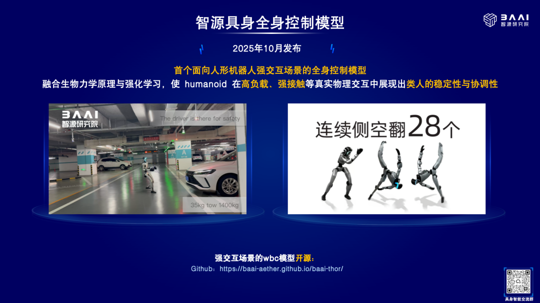 在人形机器人领域,全身控制也是非常重要的能力。前两个月大家可能有在网上看到一条非常火的视频,我们用一个35千克的G1机器人拉动1.4吨的汽车。背后驱动这台机器人的,就是全身控制框架BAAI Thor,它也驱动机器人实现了连续28个空翻的高难度全身控制。
