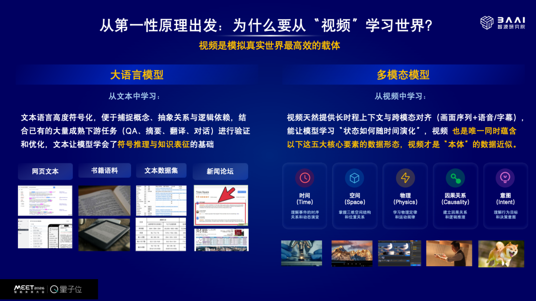 视频是目前能够大规模获得的,同时包含时间、空间、物理、因果关系、意图等各种要素的、能够高效模拟真实世界的载体。