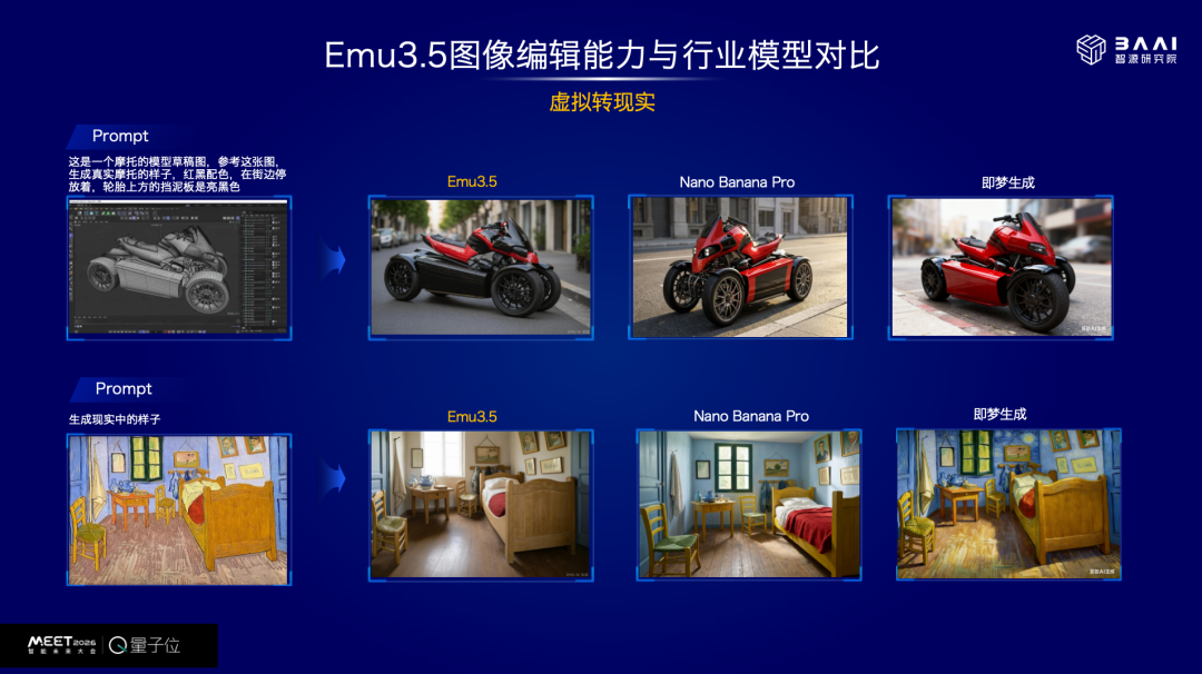 比如说在这个例子里,将摩托车的模型草稿图转成现实,我们可以看到Nano Banana还是做了很多偏离原图的“自由发挥”,观察细节可以看到与原图的差异还是比较明显的。Emu3.5则更好地保持了一致性。