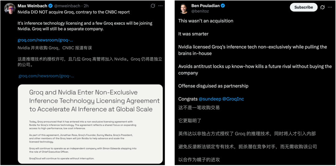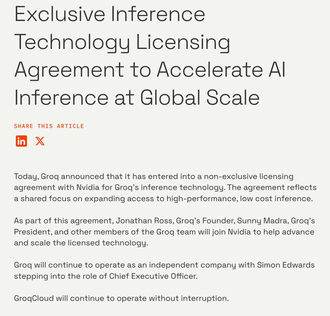 Groq官方发文做出回应:英伟达与Groq达成了一项推理技术授权协议。