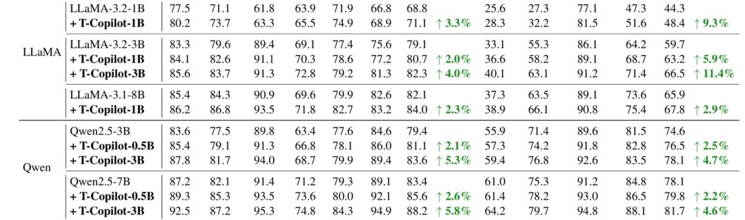 实验在多种主流模型(如LLaMA-3、Qwen2.5)和10个推理基准任务上验证了该方法的有效性。一个尤为亮眼的现象是:大模型 Pilot+小规模 Copilot+的组合,往往能显著提升性价比。