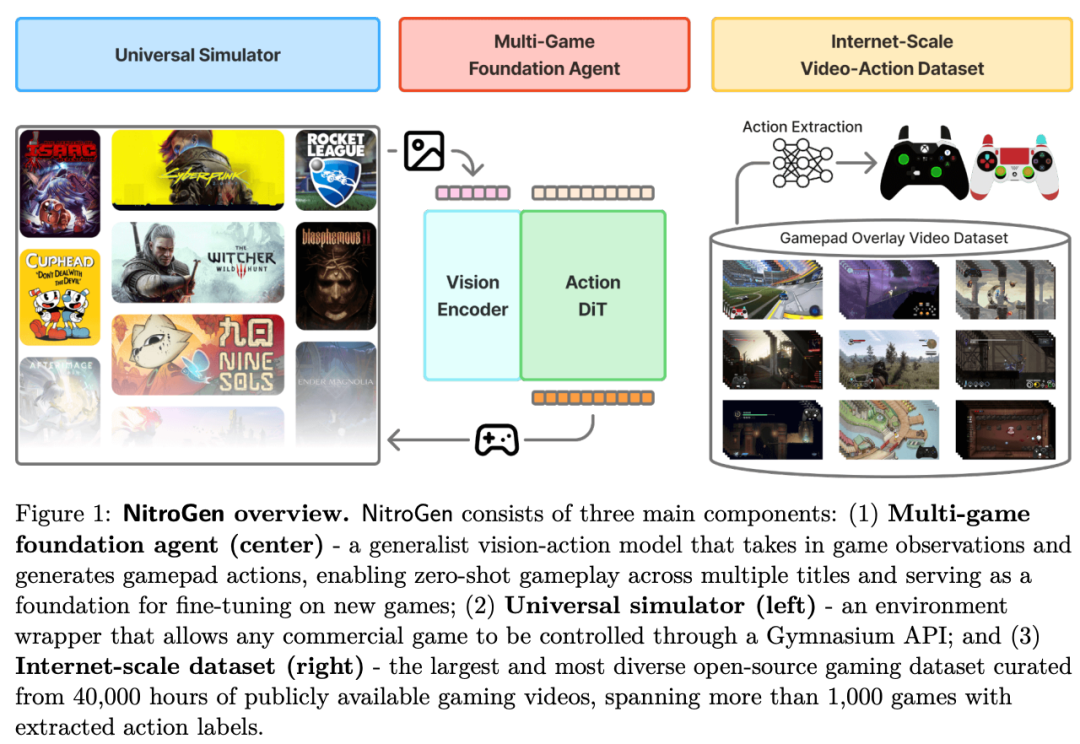 NitroGen就盯着这4万个小时的视频素材,一边看游戏画面里发生了什么(比如林克挥了一剑),一边看角落里的手柄哪个键亮了(比如按了X键)。