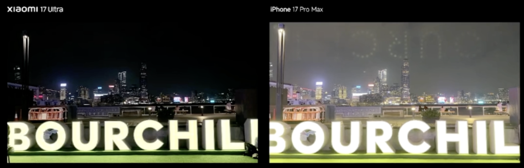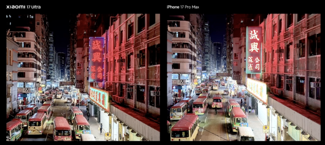 用实际效果对比就是,iPhone 17 Pro Max(右侧)拍出来的灯牌文字发生了严重变色,下方的横向广告牌更是过曝到看不清。