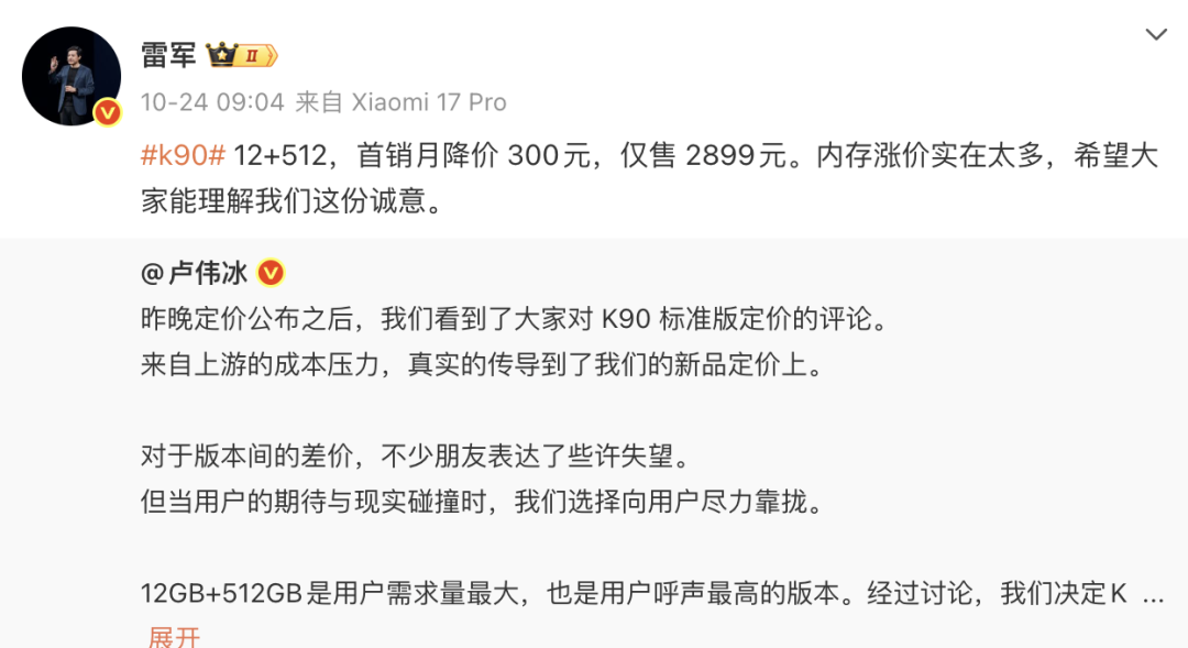 背后原因不难猜测——今年内存的涨价幅度实在是太狠了,狠到雷军之前在回应红米k90价格问题时就感叹过,实在是涨得太多了。