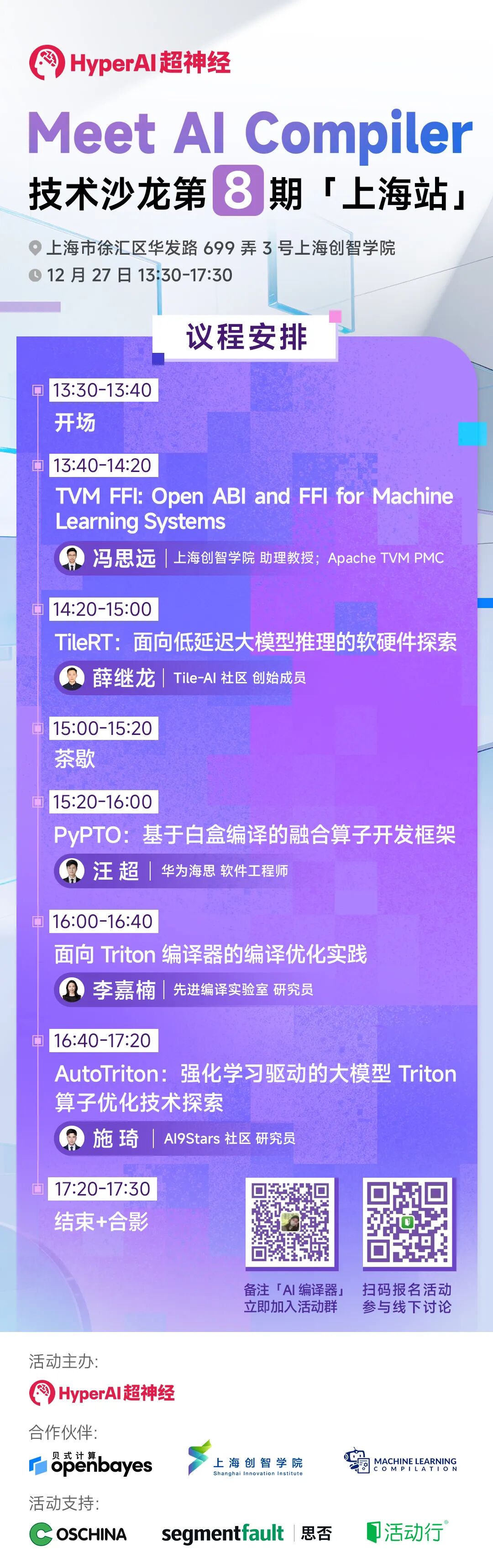 倒计时 1 天,Meet AI Compiler 第 8 期将于明天(12 月 27 日)在上海开讲!HyperAI超神经邀请了来自上海创智学院、TileAI 社区、华为海思、先进编译实验室、AI9Stars 社区的多位专家,他们将带来从软件栈设计、算子开发到性能优化的全链路分享。