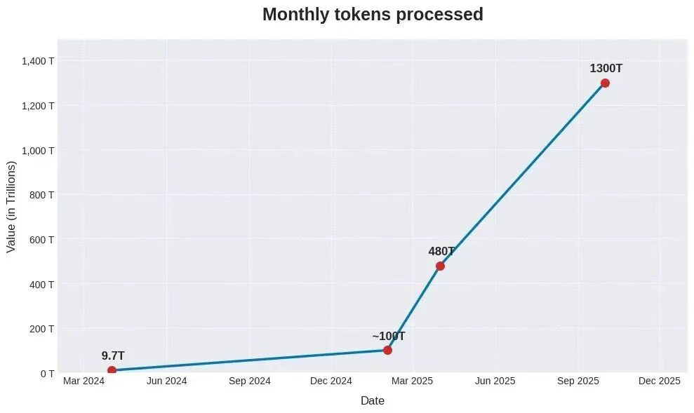 谷歌在10月披露,其各平台每月处理的token用量已达1300万亿,相当于日均43.3万亿,而一年前月均仅为9.7万亿。