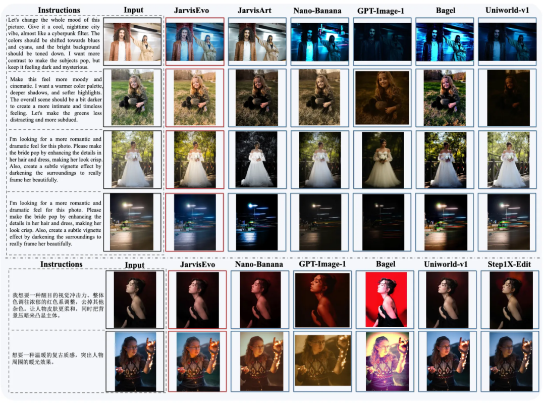 视觉效果上,对比其他模型,JarvisEvo处理后的图像更贴合用户指令,在风格营造、细节呈现等方面表现突出。