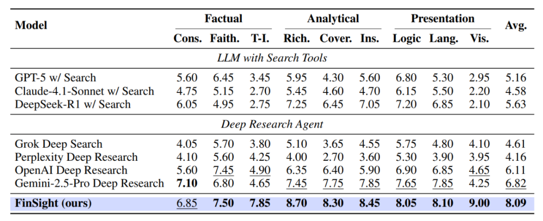 结果显示,FinSight在事实准确性、分析深度与呈现质量三项核心指标上均显著优于Gemini-2.5-Pro Deep Research与OpenAI Deep Research,综合评分达到8.09。