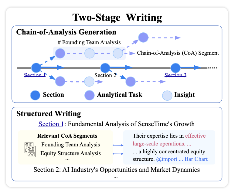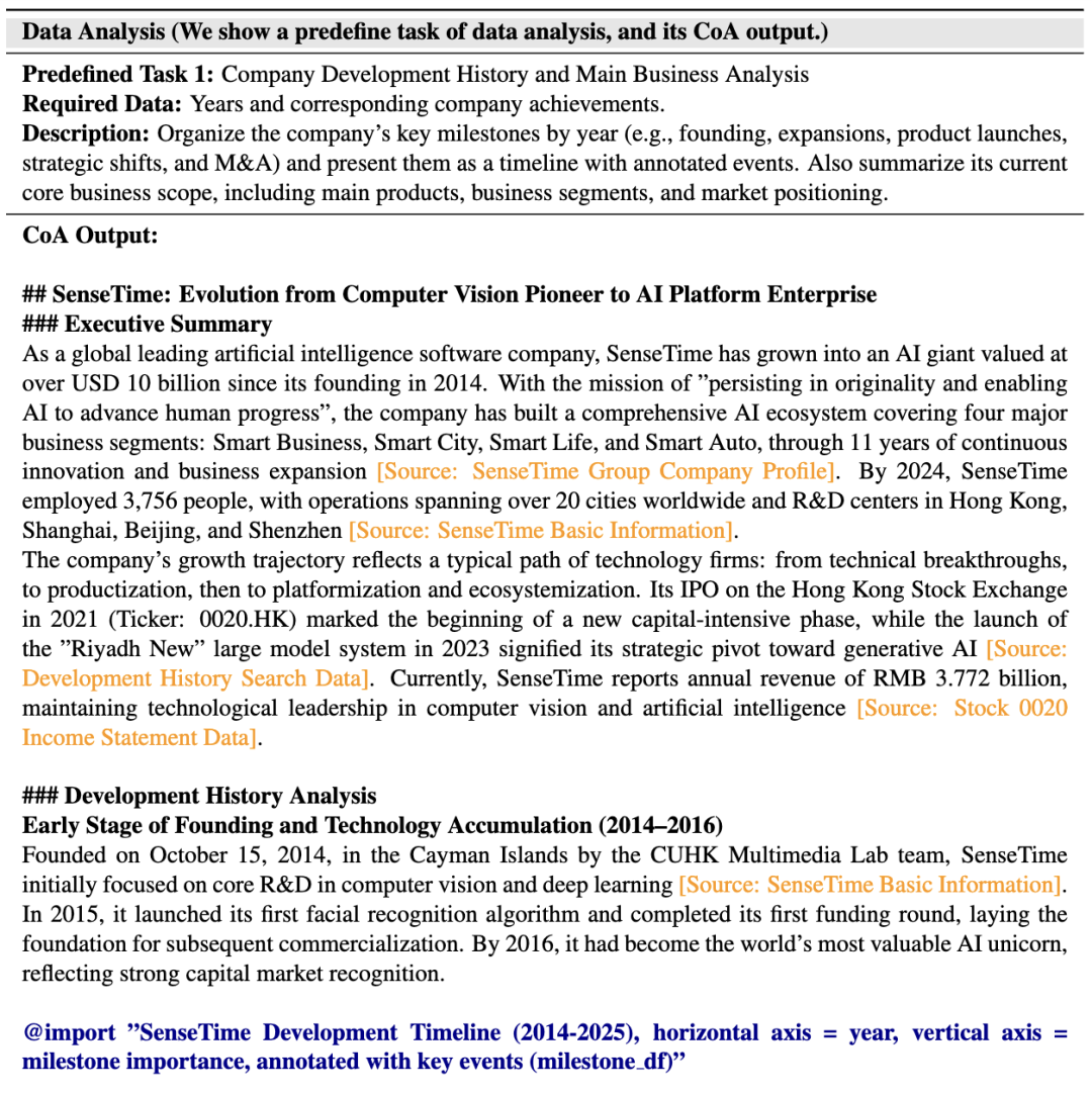 首先,系统生成一组“分析链”(Chain-of-Analysis,CoA):每条分析链对应一个明确的子任务(如公司历程、财务分析、竞争对手分析、风险因素等),在局部范围内完成证据收集、关键判断与核心结论提炼。