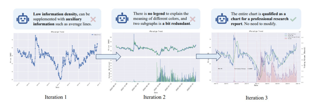 针对金融图表生成中普遍存在的专业性与可信度问题,研究者们提出了Iterative Vision-Enhanced Mechanism,将绘图过程建模为一个可迭代优化的视觉生成问题。