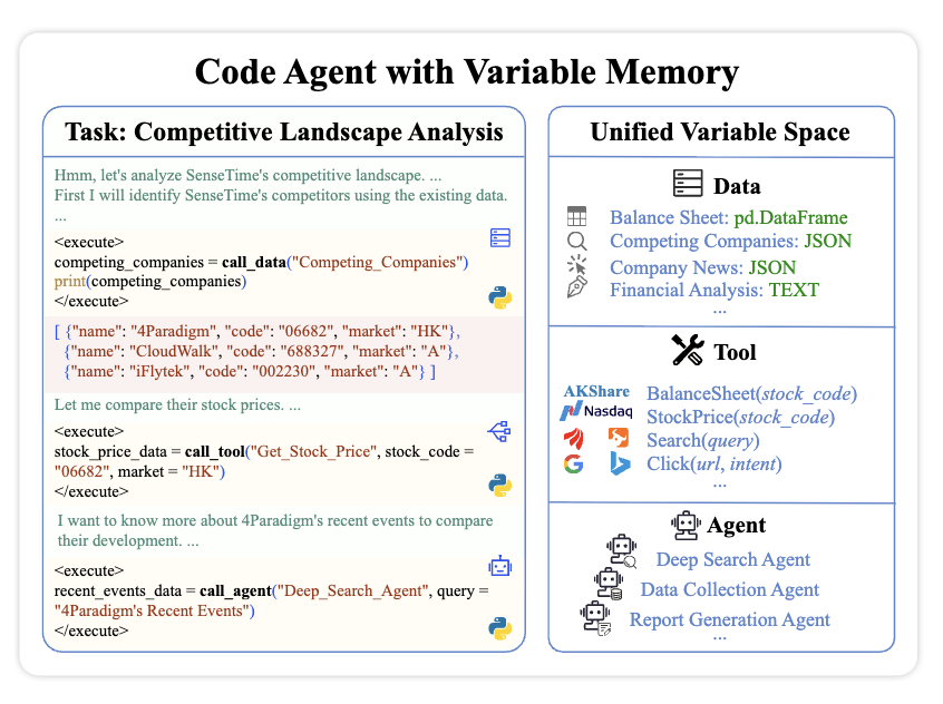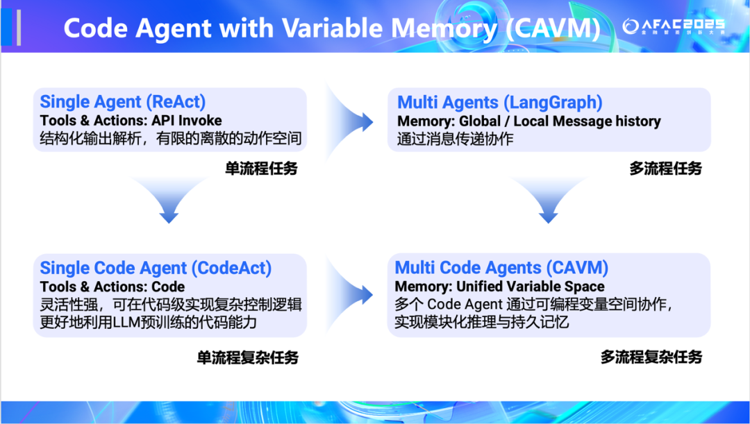 CAVM将这一范式重构为代码驱动的变量记忆空间。系统不再以自然语言对话作为协作媒介,而是将数据、工具与中间推理结果统一映射为可读写的程序变量,由多个Code Agent通过共享变量空间完成协同推理。