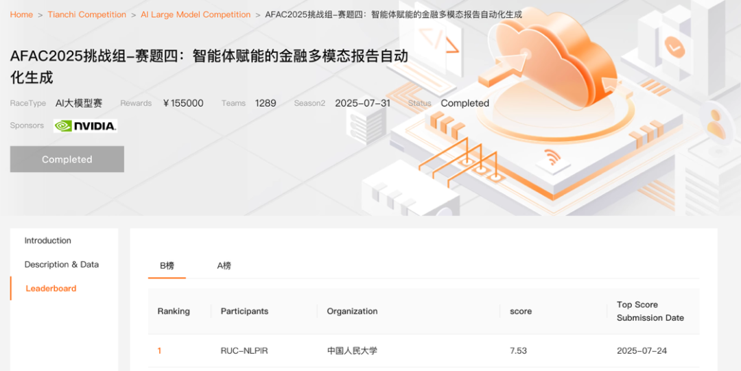此外,在AFAC 2025金融智能创新大赛中,FinSight在来自企业与高校的1289支参赛队伍中排名第一,获得挑战组赛题四冠军,进一步验证了其在真实场景中的实用性与鲁棒性。