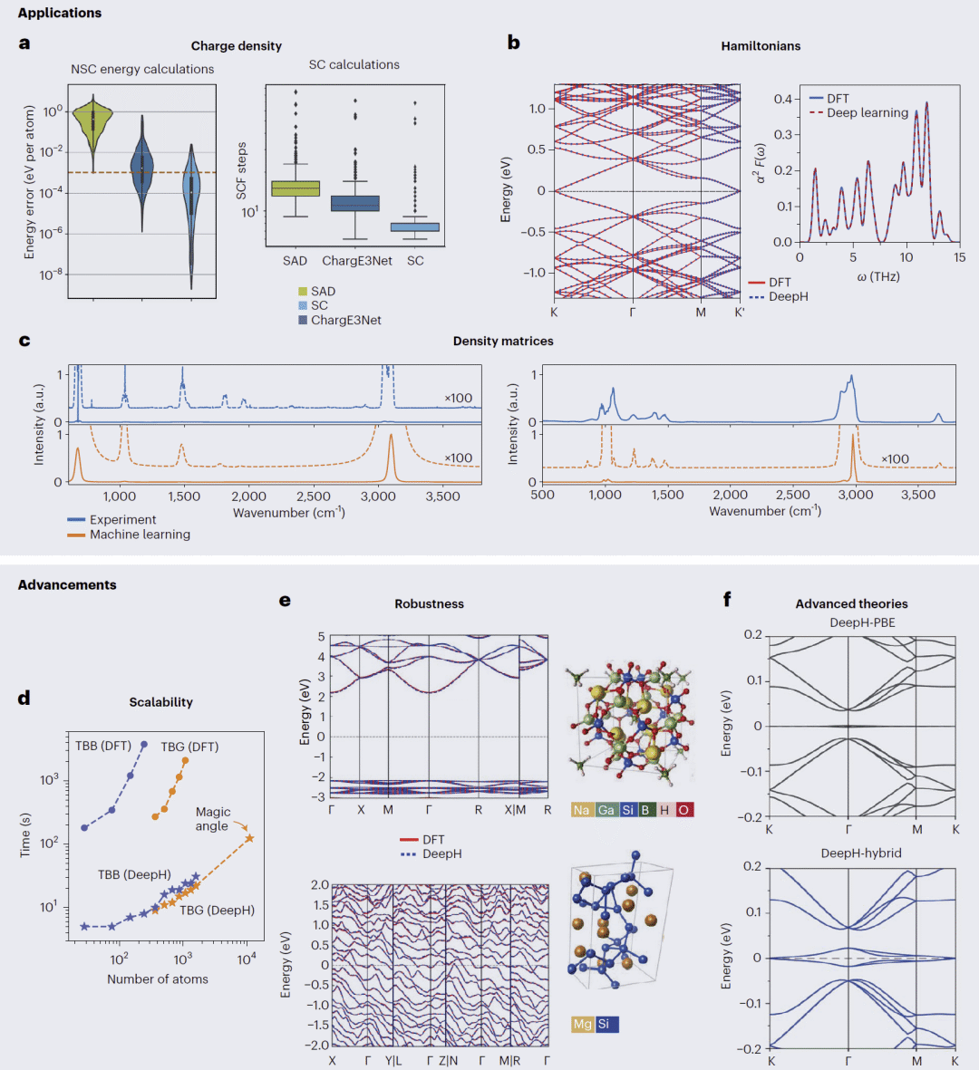 图 5|DL-DFT 在电荷密度、哈密顿量与大规模材料模拟中的代表性应用。