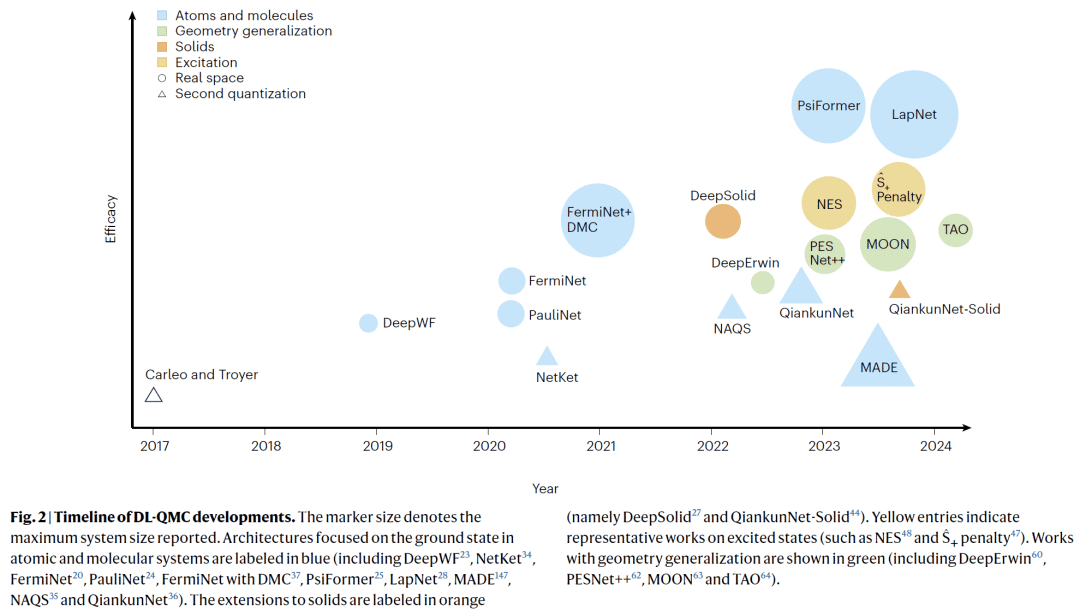 图 2|DL-QMC 方法发展的时间线与代表性网络架构。
