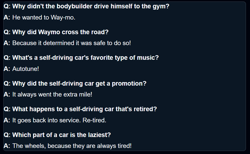 系统预装了一套批准的「老爸笑话(冷笑话)」,这些笑话是安全的、符合品牌形象的,并且有趣但克制。