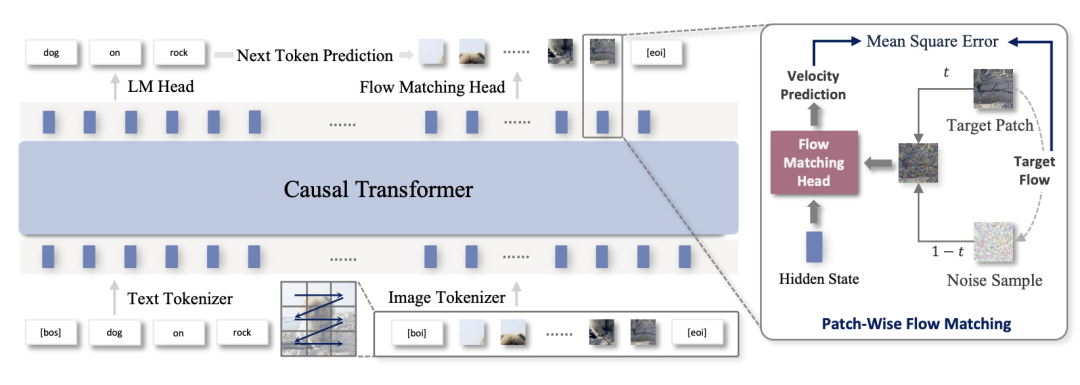 核心架构由Transformer骨干网络、用于处理离散文本 Token的标准语言建模头、用于处理连续图像Token的轻量级流匹配头,以及一个图像Tokenizer组成。