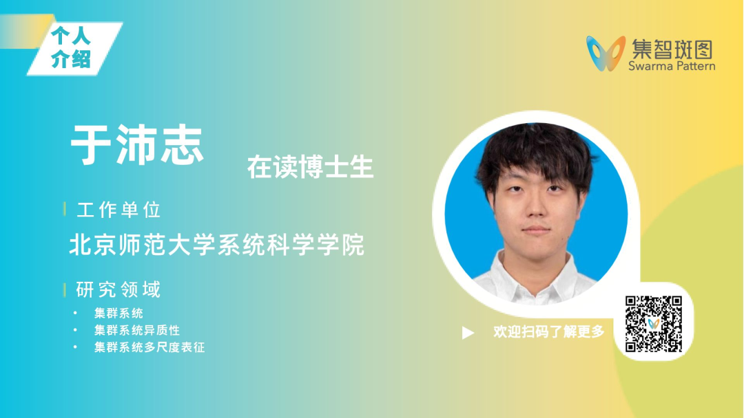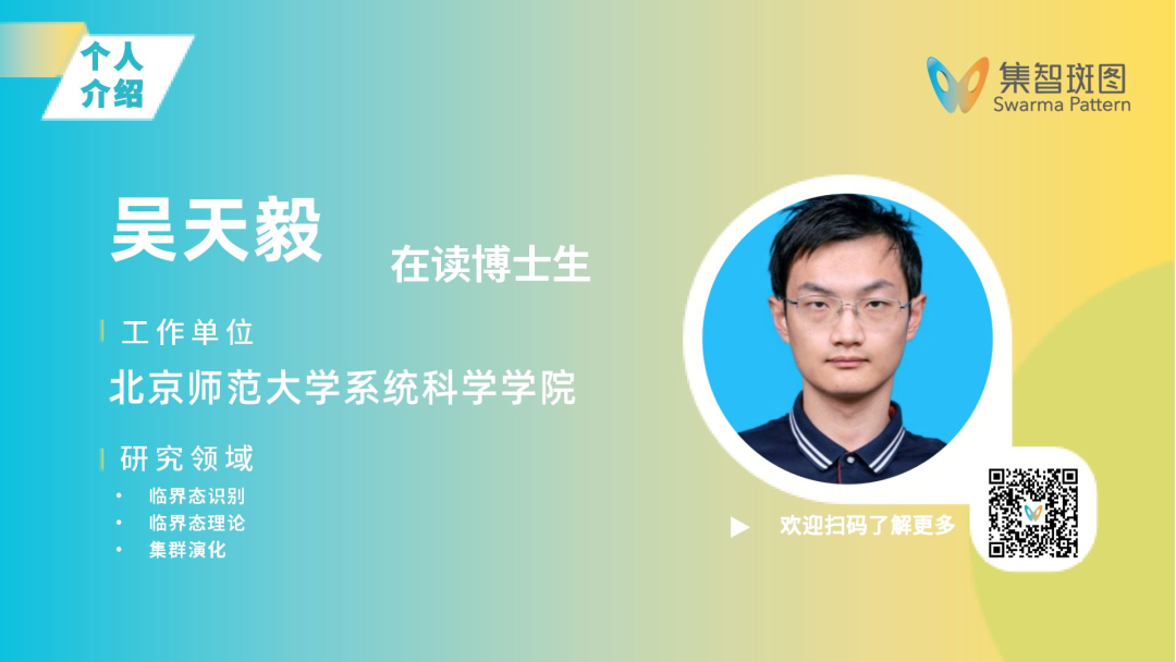 吴天毅,北京师范大学系统科学学院在读博士生。主要从事集群系统临界态识别与调控研究,聚焦集群临界态理论,致力于建立基于观测数据的生物与人工集群临界态识别方法,探索引导集群演化至临界态的调控机制,揭示临界动力学行为在追逃博弈等功能性场景中的涌现优势与应用潜力。