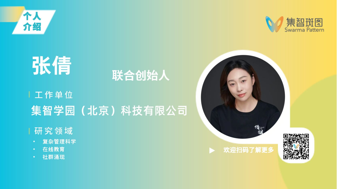 张倩,集智学园联合创始人兼CEO,南京信息工程大学人工智能学院(原信息与控制学院)硕士毕业,于2016年接手运营集智俱乐部并创办集智学园,开创了集智课堂共学模式,打造了《巴拉巴西网络科学》、《系统科学前沿》、《复杂性思维》等多期课程,组织编写《深度学习原理与Pytorch实战》、主笔《netlogo多主体建模入门》、翻译《复杂——诞生于秩序与混沌边缘的科学》,倩姐公众号主理人。