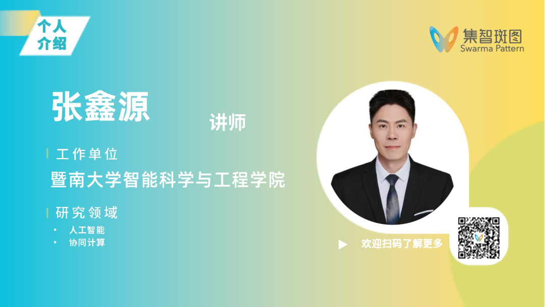 张鑫源,暨南大学智能科学与工程学院,党总支委员,人工智能系主任,硕士生导师,中国计算机学会协同计算专委,珠海计算机学会理事,广东崃智科技有限公司技术总监。主持国家自然科学基金金青年项目,广东省“双创”党建项目。曾在IEEE TEVC,TCSVT,GECCO等国际期刊和会议发表论文20余篇。担任多个国际顶级期刊审稿人。