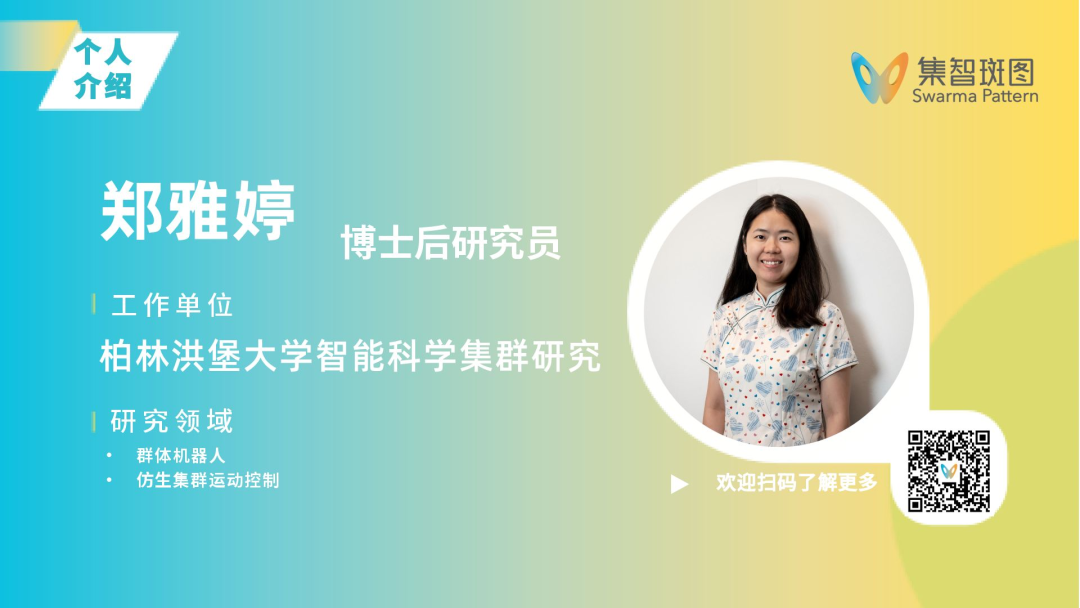 郑雅婷,柏林洪堡大学博士后研究员,并加入智能科学集群研究团队。研究方向主要聚焦于群体机器人的协同合作机制,目前涉及仿生集群运动控制、协同构建技术以及真实群体机器人系统中的主动弹性模型控制,曾基于E-puck、Stigmergic积木系统及BuilderBot机器人平台开展研究。2022年1月获得北京师范大学博士学位,并于2018年9月至2020年12月期间在比利时布鲁塞尔自由大学进行联合培养,师从Michael Allwright博士后研究员与Marco Dorigo教授。作为SCIoI项目B3的集成方向博士后,当前正基于Thymio机器人集群开展研究,致力于将不同集体行为整合为群体引导行为。