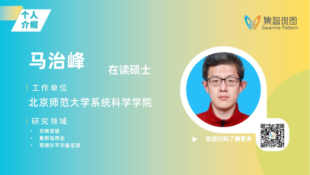 马治峰,北京师范大学系统科学学院在读硕士。主要从事范畴逻辑与集群临界态的数理逻辑刻画研究,研究工作跳出了传统的动力学模拟框架,转而从元数学的角度,探索复杂性涌现的逻辑本源。研究重点包括广义哥德尔不完备定理、范畴论解释器视角下的复杂性度量,以及利用哥德尔不完备空间刻画临界态、超验证明等。