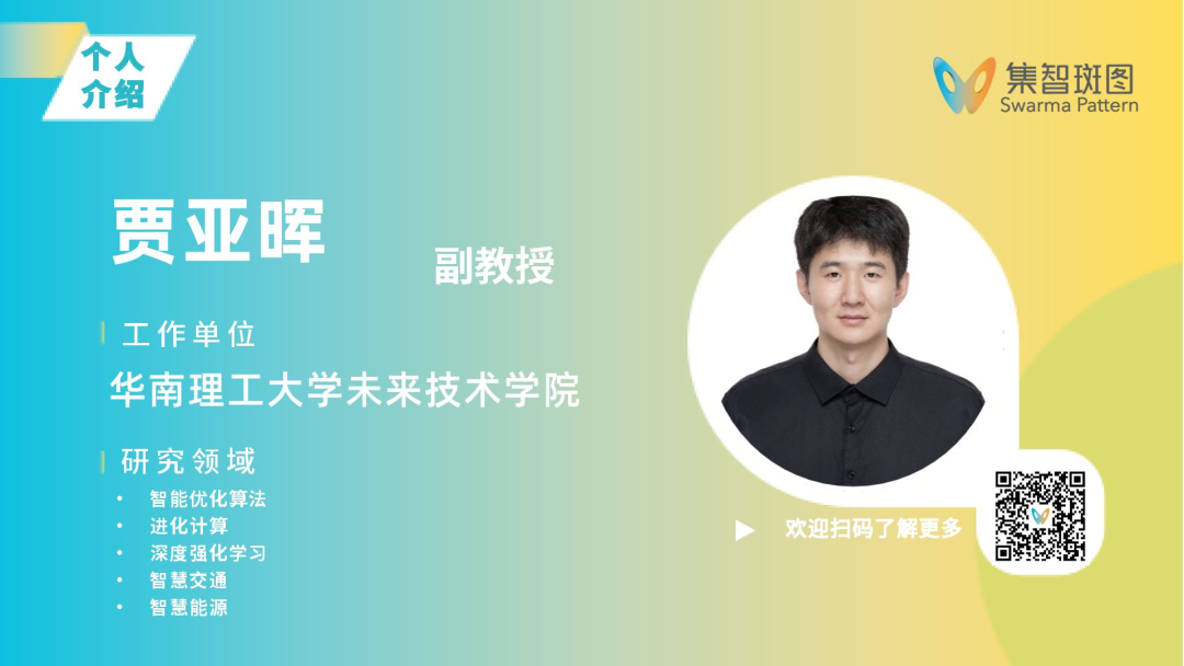 贾亚晖,华南理工大学未来技术学院副教授,博导,广东省珠江人才引进团队骨干,IEEE CIS Taskforce on Evolutionary Scheduling and Combinatorial Optimization组长,CCF协同计算专委会委员。曾担任新西兰惠灵顿维多利亚大学博士后研究员。主要研究方向为智能优化算法,包括进化计算、深度强化学习及其在智慧交通和智慧能源方面的应用,在包括IEEE TEVC, TCYB, TNNLS, WCCI等国际著名期刊和重要国际会议发表论文40余篇。担任Journal of Renewable and Sustainable Energy副编辑。