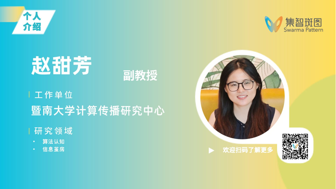赵甜芳,暨南大学计算传播研究中心特聘研究员,广东省科技创新青年拔尖人才(省部级),广州市网络舆情分级与判定标准起草专家。研究领域包括智能传播、分治型群智优化。累计发表IEEE TCYB/TKDE/TSMC/TNSE/TCSS等在内的期刊及会议论文30余篇,其中包括近10篇顶刊论文。主持国家自然科学基金青年项目一项、省部级项目三项。现为中国计算机学会协同计算专委会执行委员、中国中文信息学会SMP专委会委员,国际期刊Journal of Social Computing青年编委,担任TNNLS/TCSS/TAI/IPM/计算机学报等期刊审稿人。曾获广东省人工智能产业协会科学技术奖自然科学奖一等奖、ACM广州新星奖,近五年指导学生团队获省级以上竞赛奖励30余项,培育成果入选2023年中国计算机学会技术公益案例集。