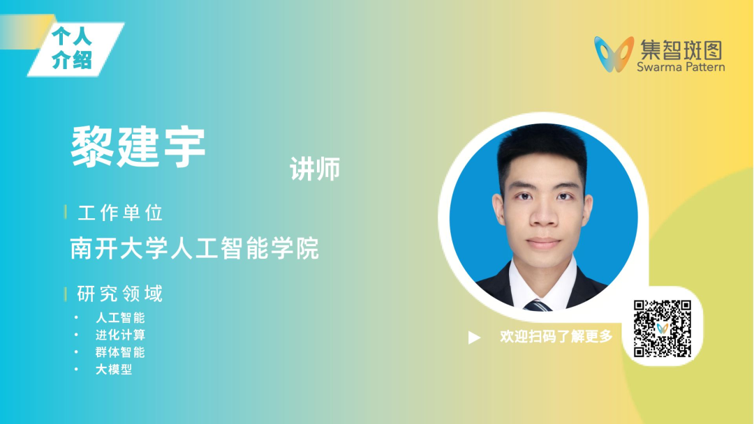 黎建宇,南开大学人工智能学院引进教师,入选人工智能领域全球前2%顶尖科学家,CAAI优秀博士论文激励计划提名,南开大学人工智能学科振兴计划;主持国自然青年、天津市青年项目B类等项目多项;主要研究方向是人工智能、进化计算、群体智能和大模型,目前已发表学术论文50余篇,包括IEEE Transactions系列的国际高水平学术期刊论文20篇,ESI高被引论文3篇,《计算机学报》等中文核心期刊论文3篇;谷歌学术引用2000余次,H-index为21;获机器智能期刊最高被引论文奖,CAAI会刊《智能系统学报》优秀论文奖;授权国际发明专利1项。
