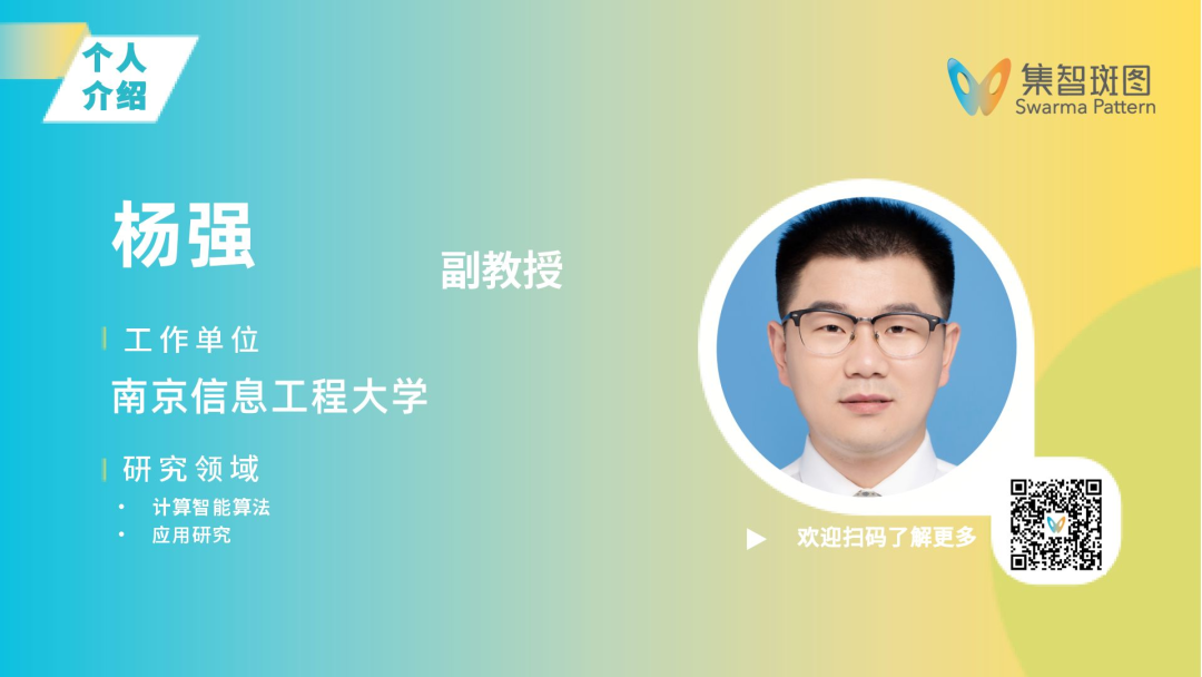 杨强,南京信息工程大学副教授(校聘教授),南京信息工程大学龙山学者,硕士生导师;分别于2014年和2019年在中山大学信息科学与工程学院和数据科学与计算机学院获得硕士和博士学位;主要从事计算智能算法及其应用研究,累计发表学术论文100余篇,其中在人工智能领域的国际顶级期刊IEEE Transactions系列期刊发表论文10余篇,累计Google Scholar引用3200余次,1篇论文入选ESI高被引论文,1篇论文获评IEEE SMC2022(CCF C类会议)最佳学生论文提名奖,1篇论文获评IEEE ICACI2023(计算智能领域旗舰会议)最佳论文奖;1篇论文获评IEEE MiTA2024(计算智能领域旗舰会议)最佳论文奖;授权发明专利15项;2020年入选江苏省双创博士计划,2022年获评校五四青年奖章,2023年获评校首批十大青年科技之星,2024年入选江苏省第七期“333工程”第三层次人才计划,主持国家自然科学基金项目2项,江苏省自然科学基金项目1项,江苏省高等学校自然科学基金面上项目1项。