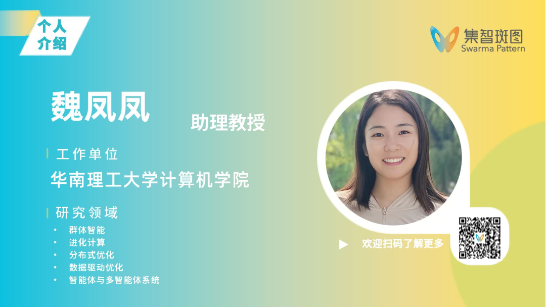 魏凤凤,华南理工大学计算机科学与工程学院助理教授,硕士生导师,主要研究方向是群体智能、进化计算、分布式优化、数据驱动优化、智能体与多智能体系统,已发表国际期刊和国际会议论文50余篇,其中IEEE Trans.长文15篇;主持国家自然科学基金青年科学基金项目、中国博士后科学基金面上项目、广东省自然科学基金面上项目等;获广东省人工智能产业协会科学技术奖自然科学奖一等奖、第四届国际分布式人工智能会议最佳论文、中国仿真学会智能优化与调度专委优博、ACM广州分会优博;现任中国计算机学会协同计算专业委员会委员。