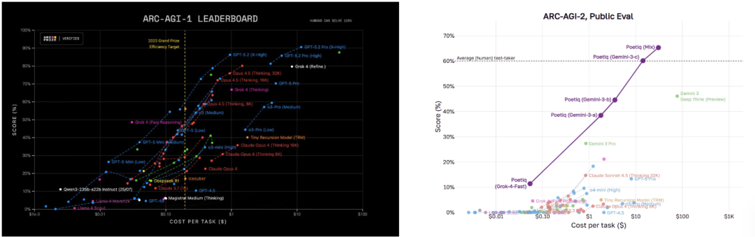 通用人工智能测试基准ARC-AGI-1,最佳成绩超过近90%;ARC-AGI-2上,AI超过了人类平均水平。