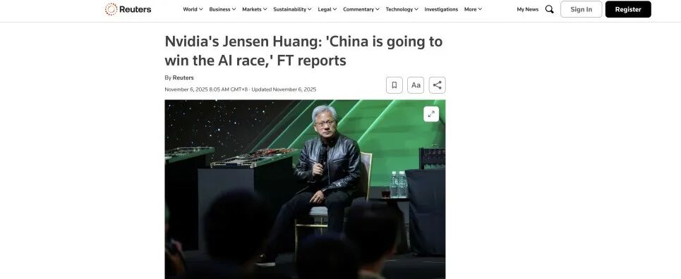 路透社报道黄仁勋对中美 AI 竞赛结局的预测