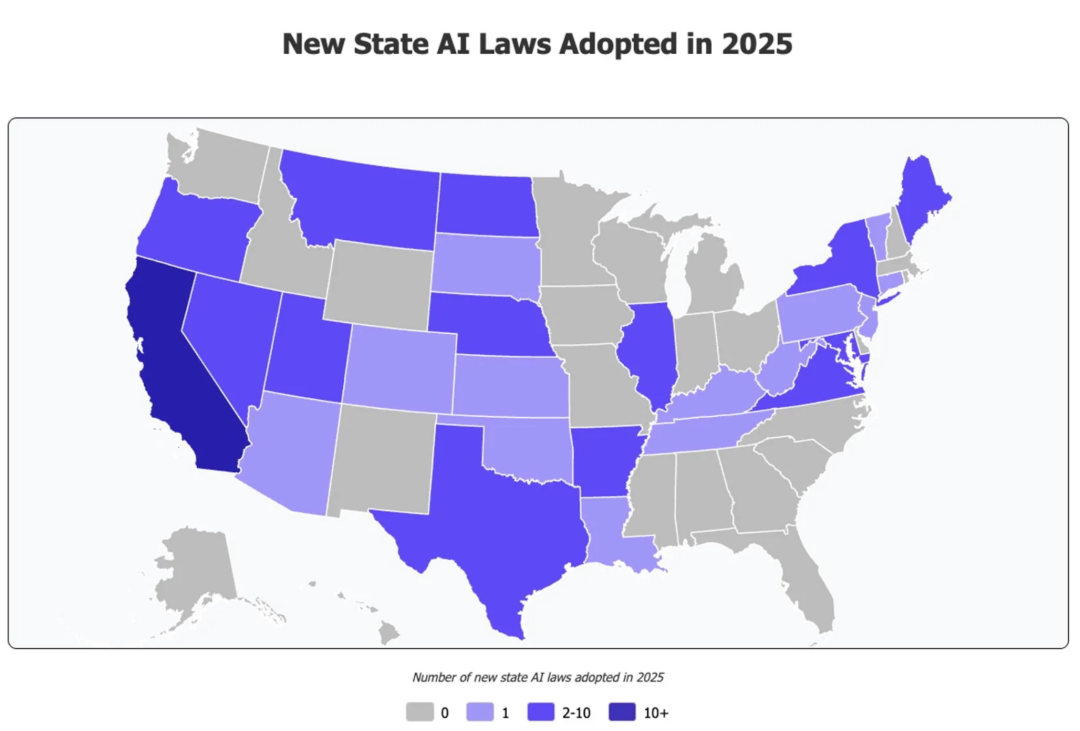 在联邦层面长期缺位的情况下,美国的人工智能监管在 2025 年呈现出明显的「地方先行」特征。根据 Transparency Coalition 发布的《2025 年州级 AI 立法报告》,截至 2025 年底,已有 27 个州签署了 73 项人工智能相关法案,涵盖模型透明度要求、Deepfake 内容限制、算法歧视防范、自动化决策问责等多个方向。对科技企业而言,这种由州政府主导的监管路径,意味着合规成本急剧上升——同一套 AI 系统,可能需要同时满足数十套不同、甚至相互冲突的法律标准。