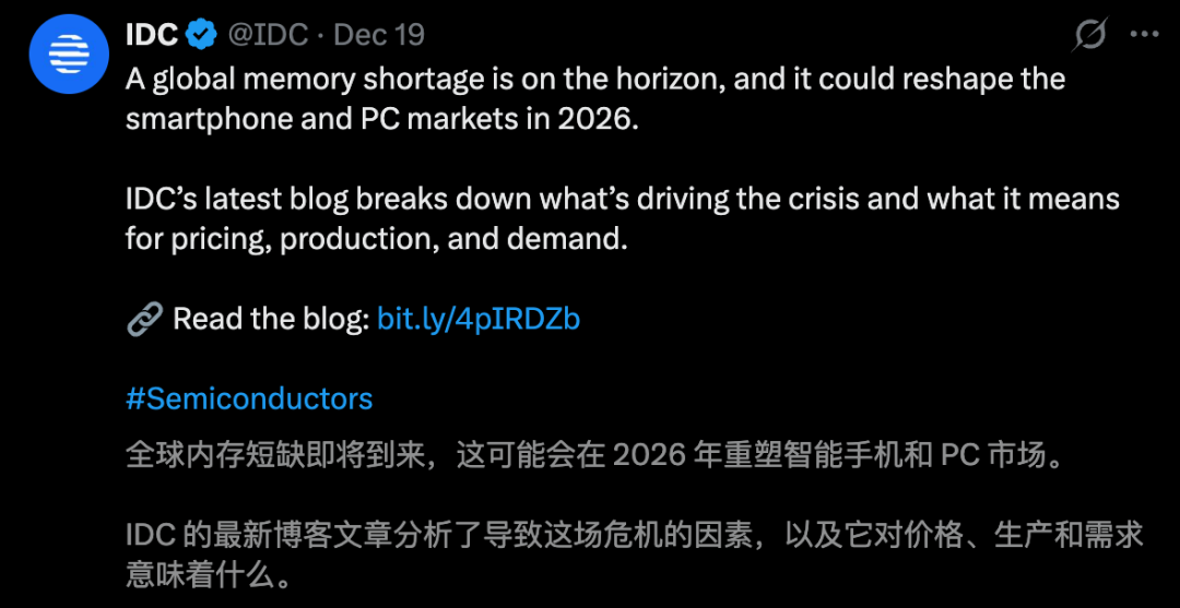 它表示,AI数据中心的需求持续猛涨,直接把内存市场从过去熟悉的「周期性波动」,推向一个更像「结构性改道」的新阶段。