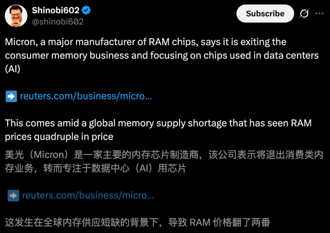 内存不够用,最直接的结果是:全世界每个人,都会被迫为AI买单。
