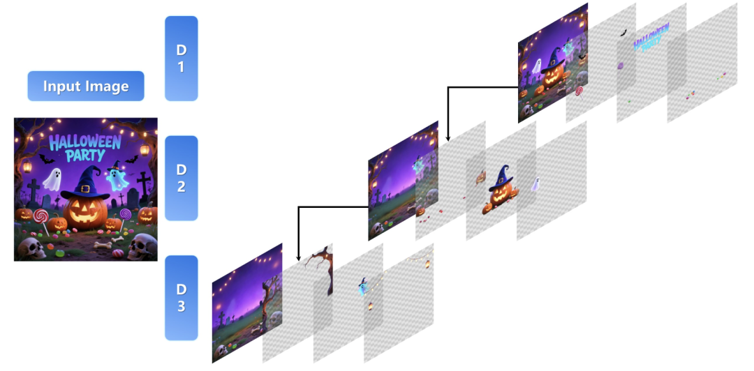 模型直接输入一张完整的RGB照片,通过扩散过程,一步步预测出多个带透明度信息的RGBA图层。