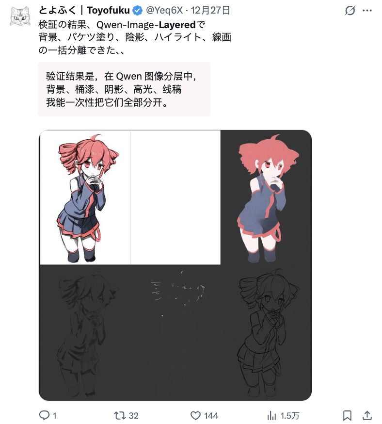 像下面这位网友,用Qwen—Image—Layered把人物元素进行一次性分层处理,最后甚至可以一路拆到只剩下一个线稿层: