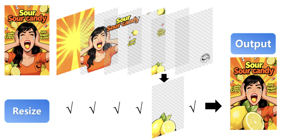 除了基本的替换编辑功能外,Qwen—Image—Layered模型还支持调整元素的大小、删除不想要的元素等等。