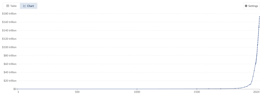 Our World in Data整理的Maddison Project数据显示,从公元 1 年到 1800 年,全球 GDP 的曲线几乎是贴着地面移动。真正的「起飞」和加速,仅仅发生在工业革命之后的这两百年里。