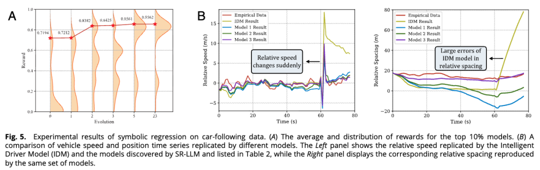 更关键的是,在人类跟车行为建模这一尚无共识的开放问题中,它不仅成功复现了经典跟驰模型的核心结构,还从真实车辆轨迹中发现了拟合性能更优、物理意义更清晰的新模型。