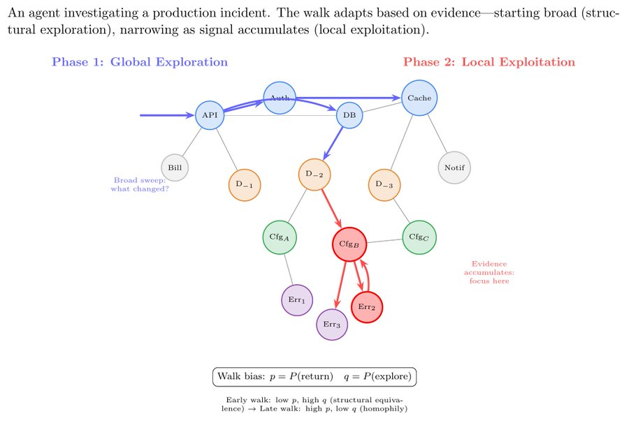 图表示学习里有一个技术是 node2vec,它的思路很有启发:你不需要看全整张图,只要在图上随机走足够多的步数,就能学到图的结构。哪些节点总是一起出现,它们之间就有很强的关联。