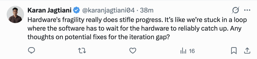 硬件约束导致迭代变慢,是一个常被低估的瓶颈。软件可以高频更新,但物理系统必须建立在可靠的机械基础上,而这需要真实时间去验证和打磨。