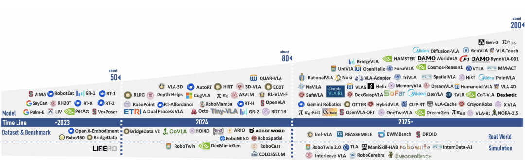 根据伦敦国王学院、香港理工大学等研究机构的最新综述,仅2025年一年就发表了超200篇VLA工作。