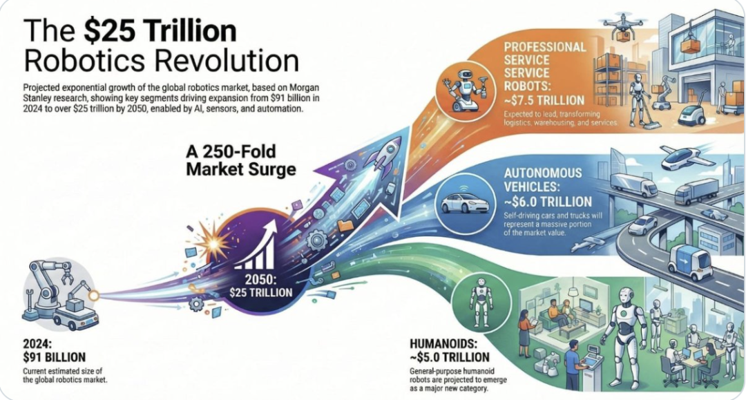 据摩根士丹利的研究,机器人产业有望从当前的910亿美元激增至2050年的25万亿美元。